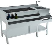 Deze robuuste cocktail bar station is speciaal ontworpen voor gebruik in professionele bars en biedt een efficiënte werkplek voor het bereiden van drankjes. Hij is uitgerust met een geïsoleerde ijsbak met dividers, met aan de voorzijde een handige ‘speedrail’ voor snelle toegang tot flessen en een schap voor een blender. De opstaande rand aan de achterzijde voorkomt dat items van het station vallen. Het model wordt geleverd met sifon en standpijp, maar zonder kraan. De afmetingen zijn 1400x740x900 mm (LxDxH) – gewicht 71.8 kg.