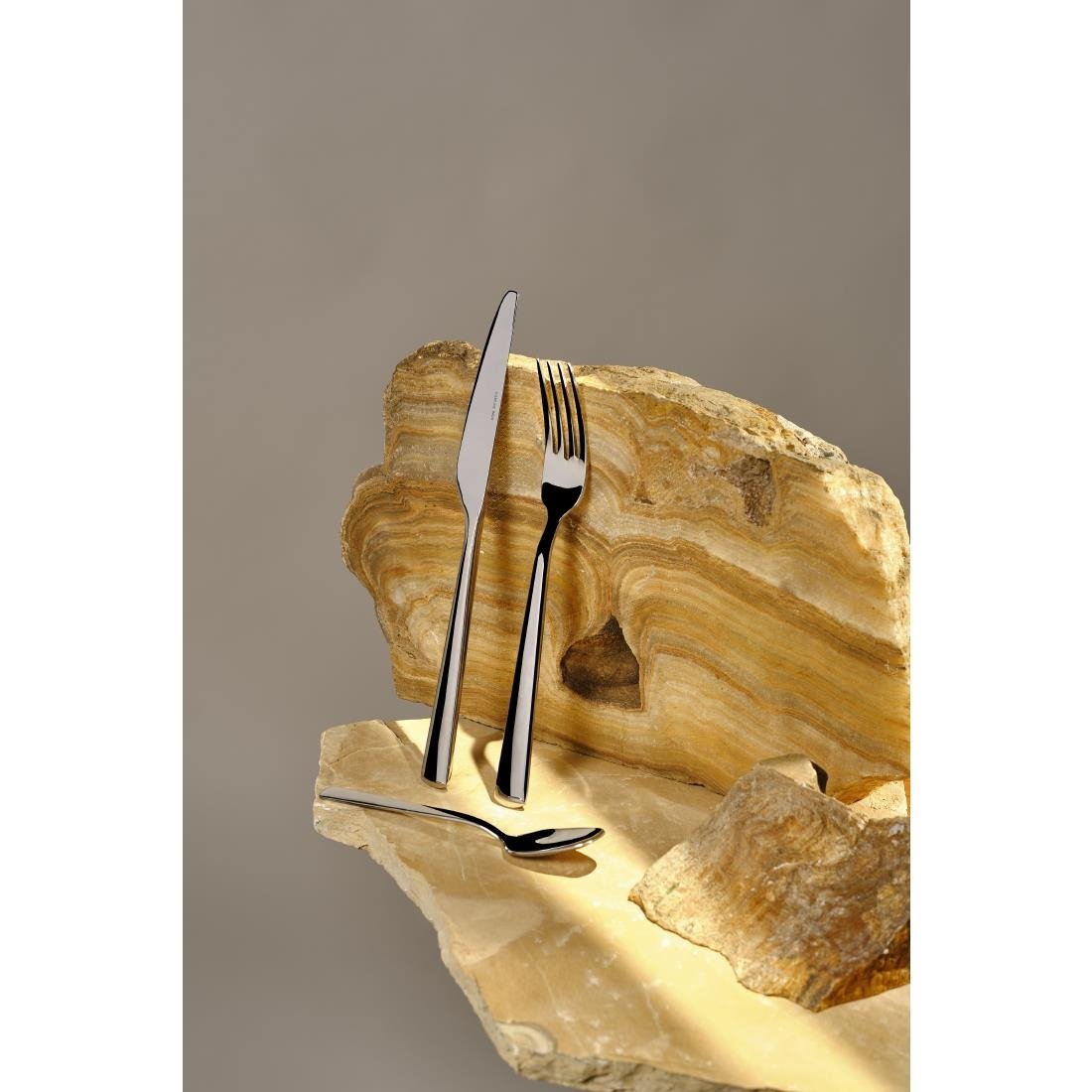 Een veelzijdig bestek met een klassiek lijnenspel in een modern jasje. De afgeronde hoeken van de messen en vrijwel lijnrechte lijnen van de lepels zijn details die dit bestek een uniek karakter geven. De subtiel golvende lijnen creëren een subtiel silhouet vol persoonlijkheid.