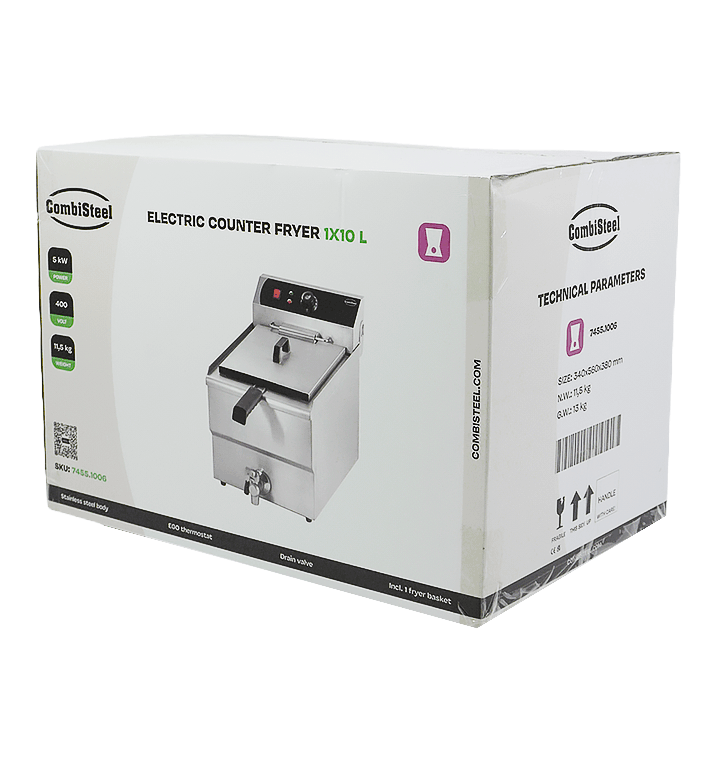 Deze Combisteel elektrische tafelfriteuse is speciaal ontworpen voor professionele keukens, buffetten, catering en evenementen. Met een ruime capaciteit van 10 liter kan je makkelijk grote hoeveelheden voedsel bereiden, ideaal voor drukke momenten. Het compacte ontwerp past in iedere keukenopstelling, terwijl de robuuste roestvrijstalen constructie en krachtige prestaties zorgen voor knapperige en perfect gefrituurde gerechten. De afmetingen zijn 340x560x380 mm (LxDxH) – spanning 400 Volt – vermogen 5 kW – inhoud van 10 liter – gewicht 11.5 kg.
