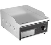 Perfect voor zowel thuisgebruik als kleine professionele keukens, biedt deze compacte bakplaat gelijkmatige warmteverdeling en nauwkeurige temperatuurregeling. Dankzij de RVS behuizing en de uitneembare olieopvangbak is schoonmaken een fluitje van een cent. Bereid de heerlijkste gerechten met gemak en stijl. De afmetingen zijn 360x450x220mm (LxDxH) – verbruik 2.0 kW – temp. +50/+300ºC – gewicht 16.5 kg.
