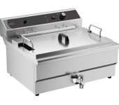 Een handig apparaat voor elke professionele keuken of evenement waar bijvoorbeeld specialiteiten als donuts, oliebollen of vis in gebakken kunnen worden. Deze ruime friteuse combineert gebruiksgemak met krachtige prestaties, waardoor je moeiteloos grote hoeveelheden knapperige frietjes, snacks en andere lekkernijen kunt bereiden. Vervaardigd uit hoogwaardig roestvrij staal, biedt hij niet alleen stabiliteit maar ook een gemakkelijk schoon te maken oppervlak. De afmetingen zijn 590x570x370mm (LxBxH) – capaciteit 25 liter – verbruik 6 kW – vermogen 400V – temp. +50/+300ºC – gewicht 14.8 kg.
