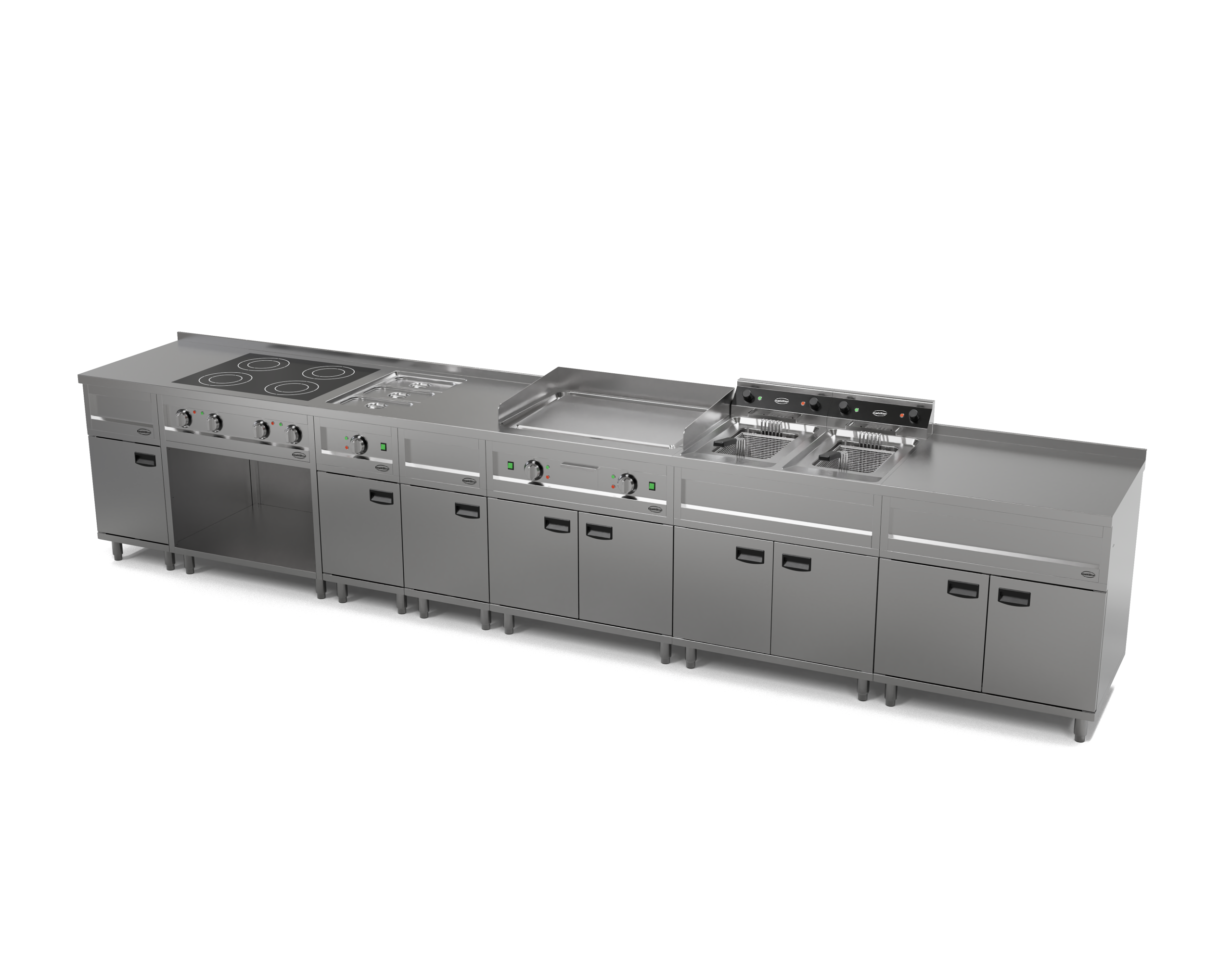 - Modulair systeem: uitbreidbaar met een bakplaat, inductiefornuis, bain-marie of neutraal element binnen dezelfde lijn