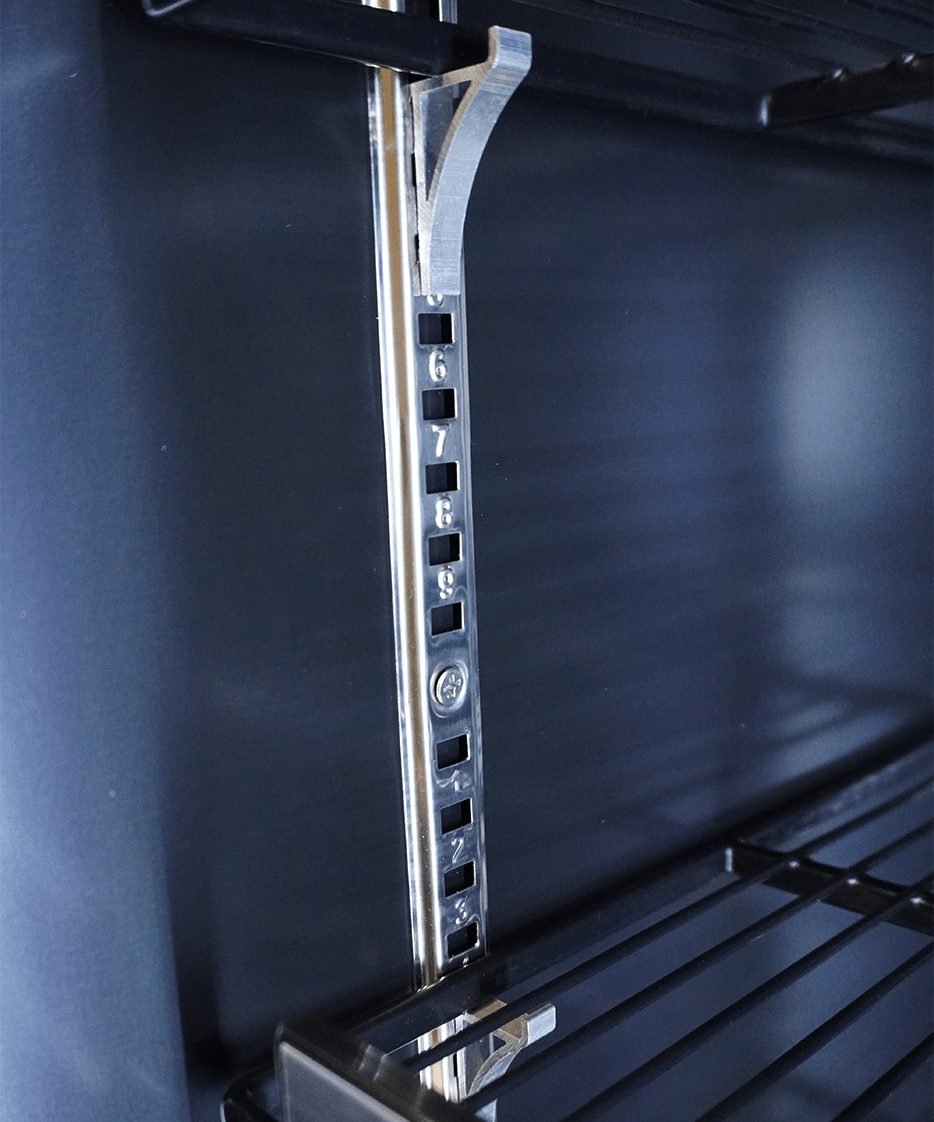 Deze zwarte koelkast heeft een moderne uitstraling, zelf sluitende deur, verstelbare schappen en digitale temperatuur aflezing. Het geventileerde koelsysteem zorgt voor efficiënte koeling, terwijl automatische ontdooiing het onderhoud minimaliseert. De LED-verlichting verlicht je producten optimaal en de deurverwarming voorkomt condensvorming, eenvoudig in- of uit te schakelen. De afmetingen zijn 620x705x2050mm (LxDxH) – verbruik 0.3 kW – inhoud 450 liter – temp. 0/+10ºC – gewicht 105 kg.