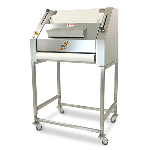 De Sinmag Europe model SM380S is een professionele stokbroodmachine met 3 uitwalscilinders en volledig RVS. Deze bakkerij stokbroodmachine heeft mechanische instellingen voor uitwalsen en opmaak en vilten transportbanden. Kan deegstukken bewerken tussen 50 en 1200g. Is tevens voorzien van uitschuifbare opvangplaat.