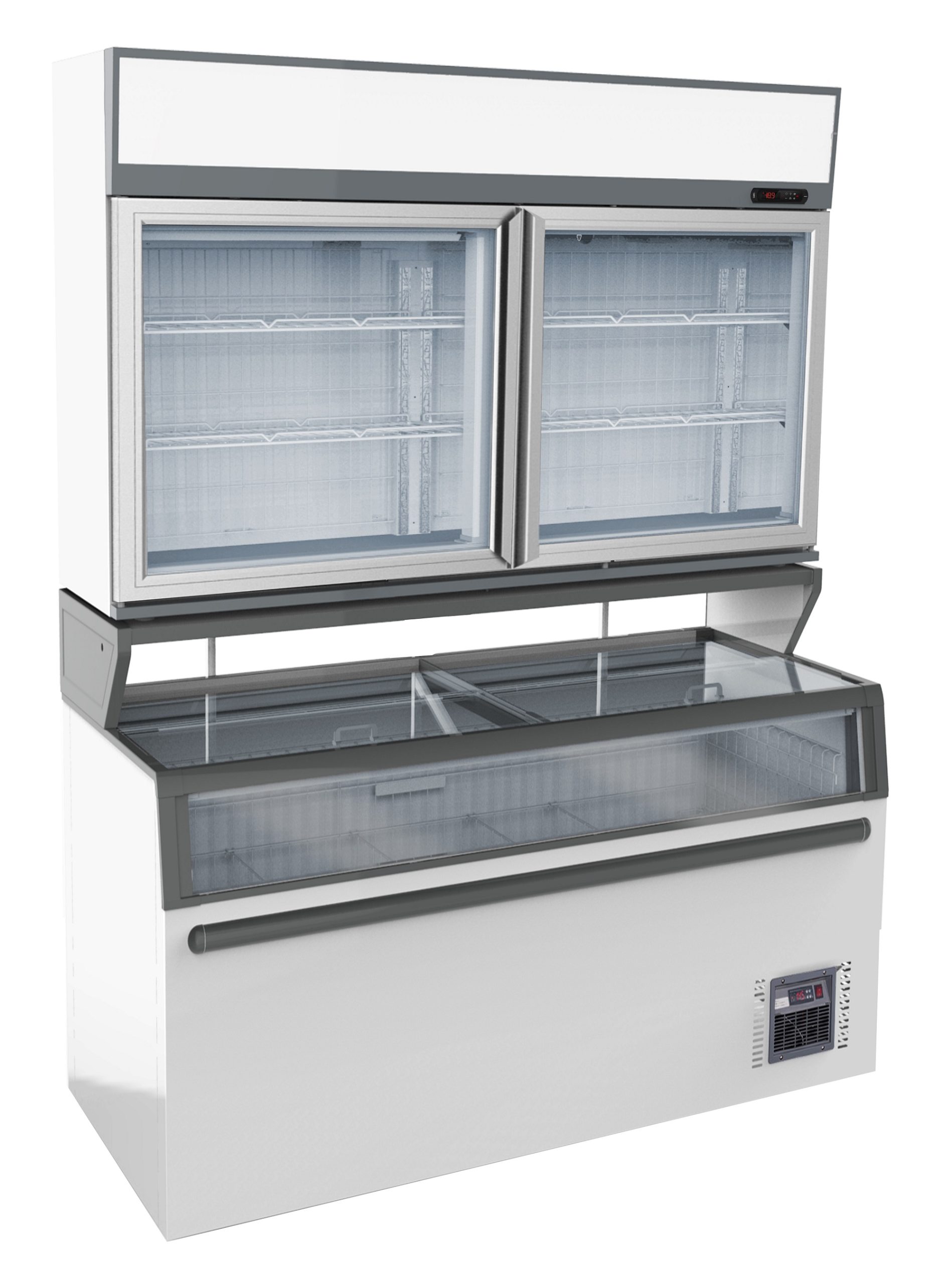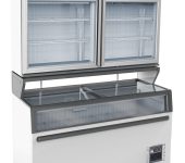 Deze innovatieve vrieskist bestaat uit twee afzonderlijke compartimenten: bovenop bevindt zich een geventileerde vrieskast, terwijl de onderzijde een statische vrieskist bevat. De geventileerde bovenste vrieskast zorgt voor een snelle en efficiënte luchtcirculatie, terwijl de statische koeling aan de onderzijde een betrouwbare en gelijkmatige bevriezing garandeert. De glazen deuren aan de bovenzijde geven direct zicht op de inhoud, met al je producten op ooghoogte. Dankzij de automatische ontdooiing wordt het onderhoud vergemakkelijkt. De energiezuinige LED-verlichting zorgt voor een mooie product presentatie, terwijl het design perfect past in een moderne inrichting. Afmetingen: 1454x890x2110 mm (LxDxH) – verbruik: 1,15 kW – inhoud: 373 / 575 liter – temperatuur: -18°C – gewicht: 298 kg.