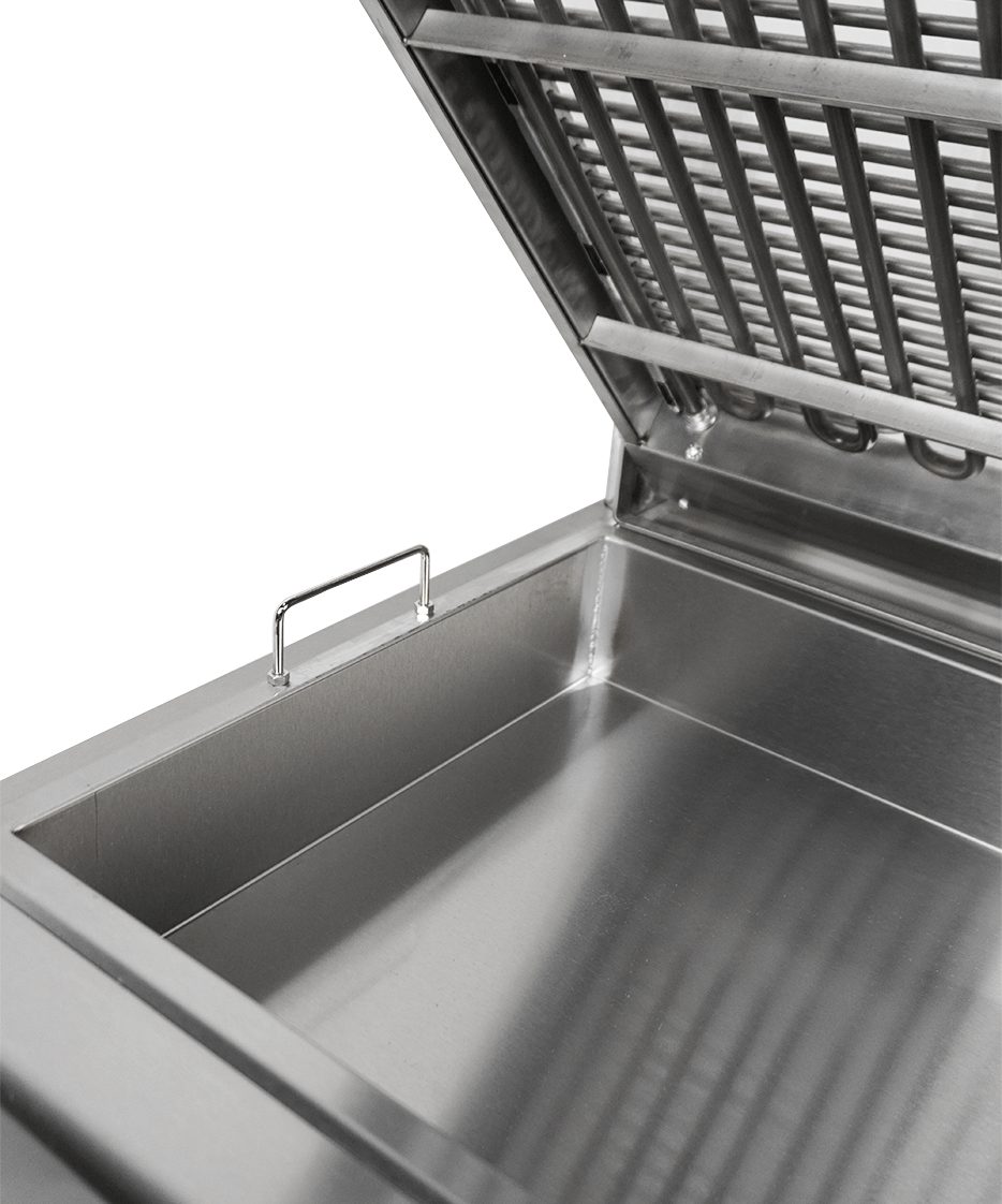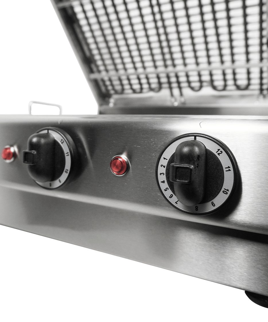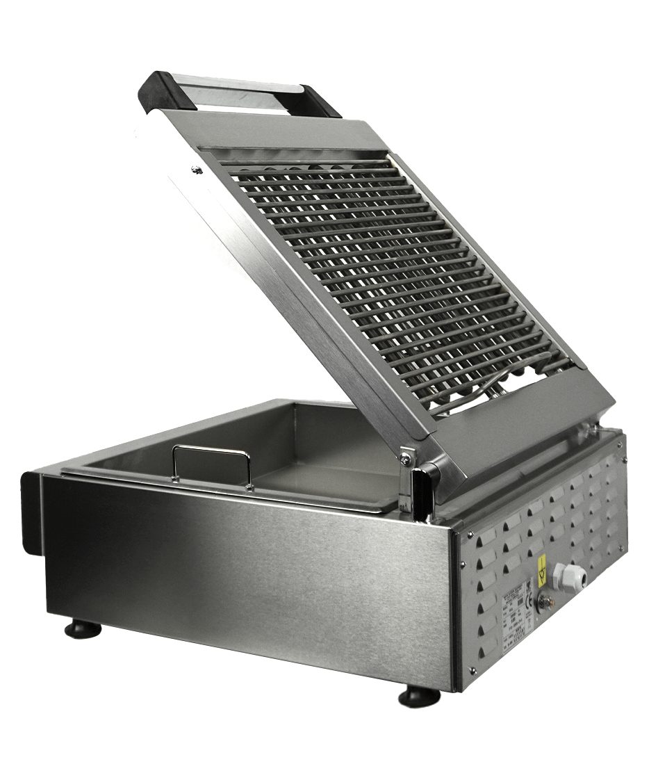 Met een royale grillplaat van 410×340 mm en een geïntegreerde waterbak onder de plaat wordt rookvorming verminderd en blijft het voedsel sappig. Dit zorgt voor een gezondere bereiding én een aangenamere werkomgeving.